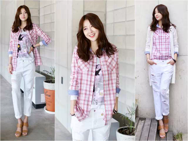 玫红格纹衬衫,款式胸前开双袋,和领口、袖口贴牛仔布装饰设计,富有美感。里搭印花衬衫,敞开衬衫露出花纹点缀很甜美,下搭白色牛仔裤,而裤身破洞和翻脚边装饰,看起来十分时尚潮流。