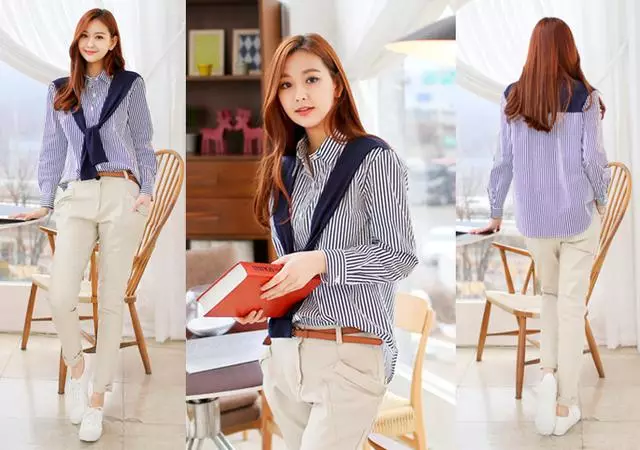 蓝色条纹衬衫显得沉稳大气,背部拼接毛织布片设计很个性,下搭杏色梭织裤露出脚裸来,在搭配白色板鞋,给人休闲时尚精神气。