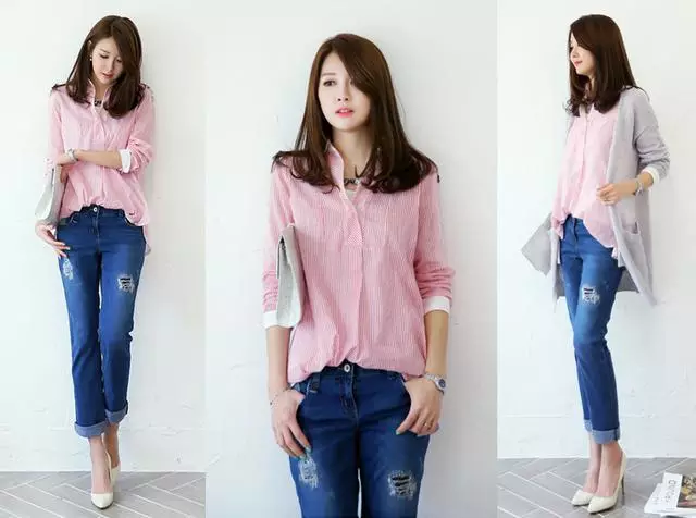 玫红条纹衬衫,面料轻薄凉爽舒适,内搭白色背心漏领袖,带点层次感。下搭蓝色破洞牛仔裤,记住宽筒牛仔裤十搭九翻脚口边,脚上穿高跟鞋特别高挑美。