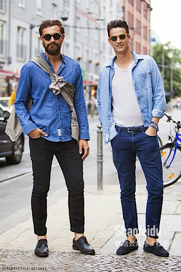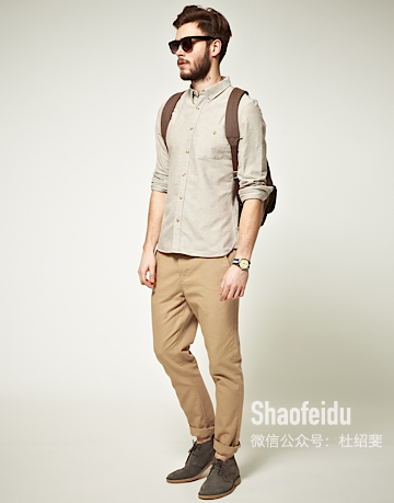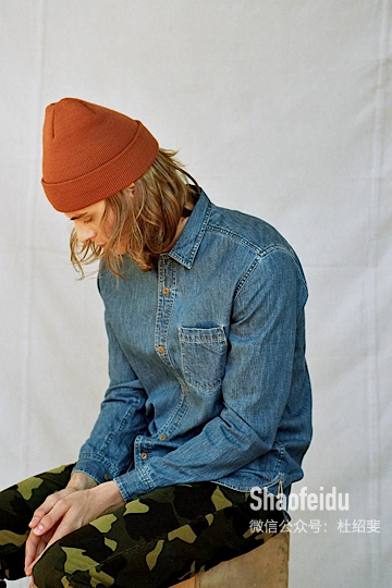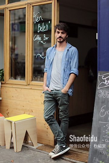 当然,如果喜欢牛仔衬衫又不想太风格化,也有比较随意的穿法,不要系纽扣配Tee,Chinos和Chucks,就没有那么强势: