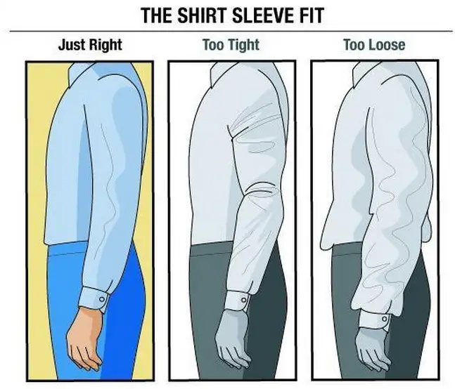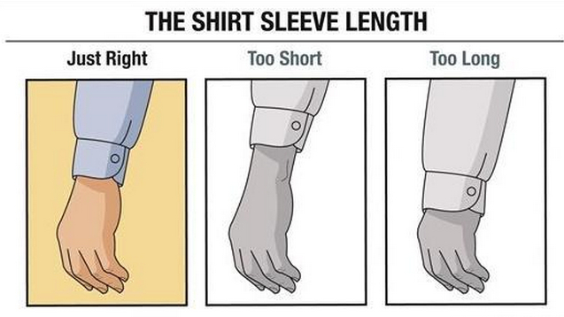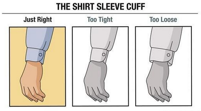 恰好合适:袖管的长度刚好到手腕处,可以对比夹克,衬衫袖管的长度应当超过夹克袖口半英寸。