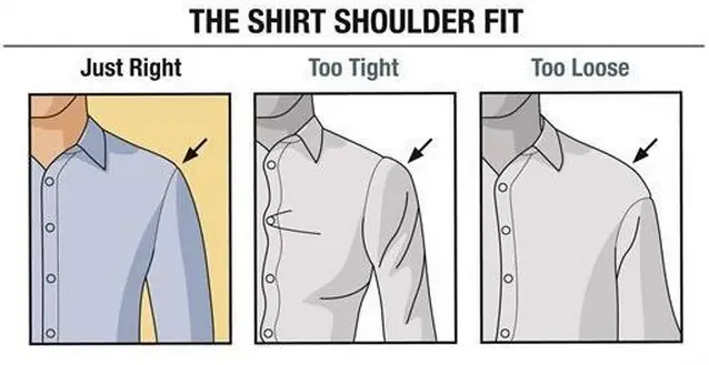 恰好合适:衬衫的肩线垂直,顺着肩膀而下,挥动手臂不会将肩线扯拽或者扭曲。