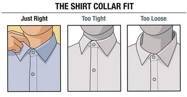 过于宽松:衬衫衣领不围着颈脖,相对而言身体会比较放松舒适,可以将手指绕脖颈一周而完全不触碰衬衫衣料。